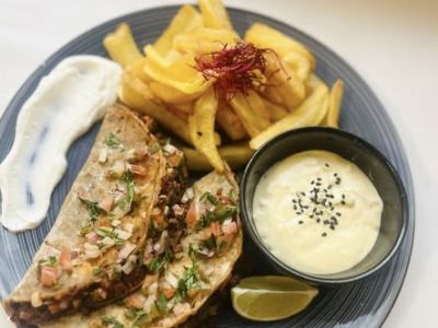 1ks tortilla s trhaným husím masem, zeleninou a dresinkem