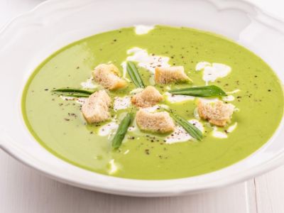 Krém z medvědího česneku s bylinkovými krutony a petrželkovým olejem