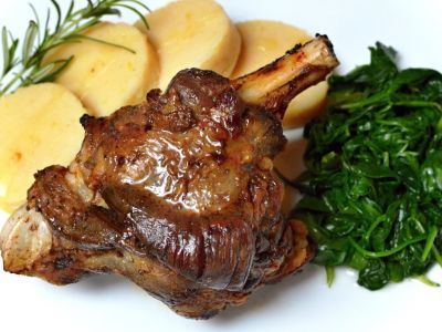 Jehněčí roláda s kopřivovou nádivkou, bramborová kaše s hrubozrnou hořčičí, máslová karotka