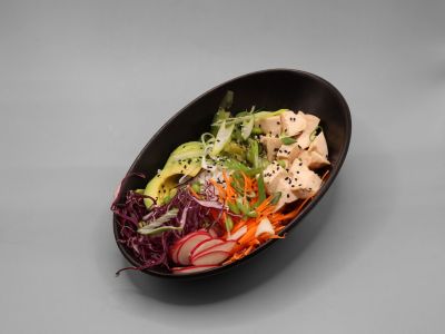 Zeleninový salát s kuřecími stripsy a jogurtovým dresingem, pizza chleba