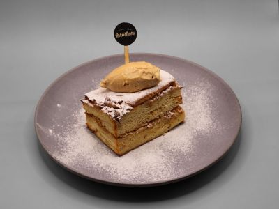 Vejce Benedikt Carbonara (brioška, pečená slanina, zastřené vejce, holandská omáčka, Pancetta, Parmazán, polníček)