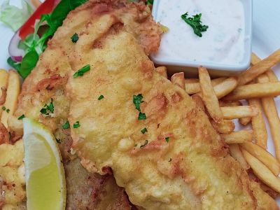Pečená vepřová žebírka marinovaná v pivní marinádě s hranolky a salátkem Coleslaw