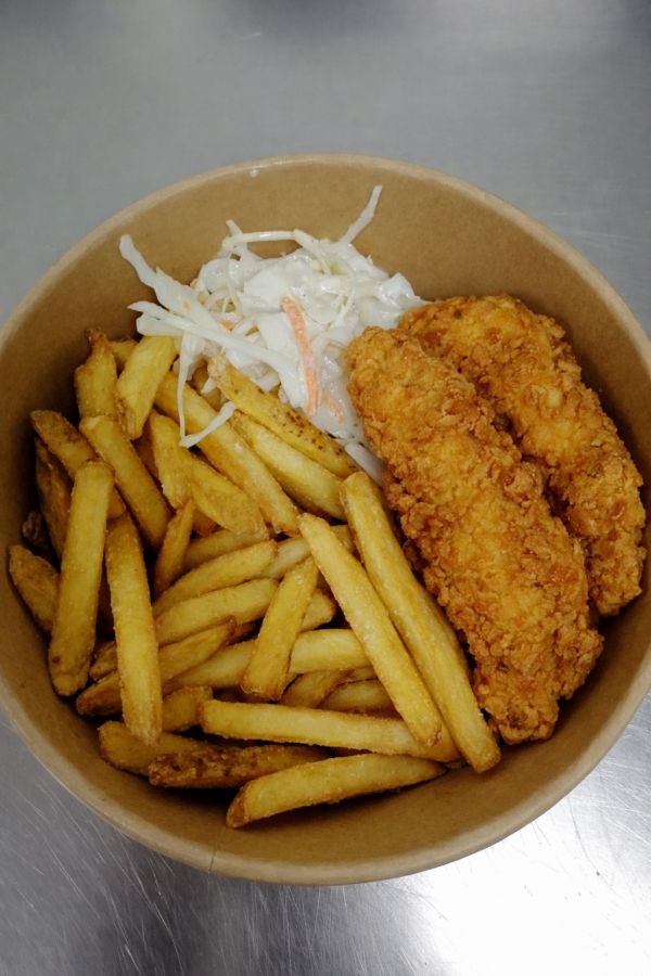 Smažený květák s hranolkami, colleslaw, tatarka