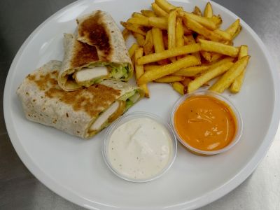 Smažený sýr se šunkou, hranolky, tatarka