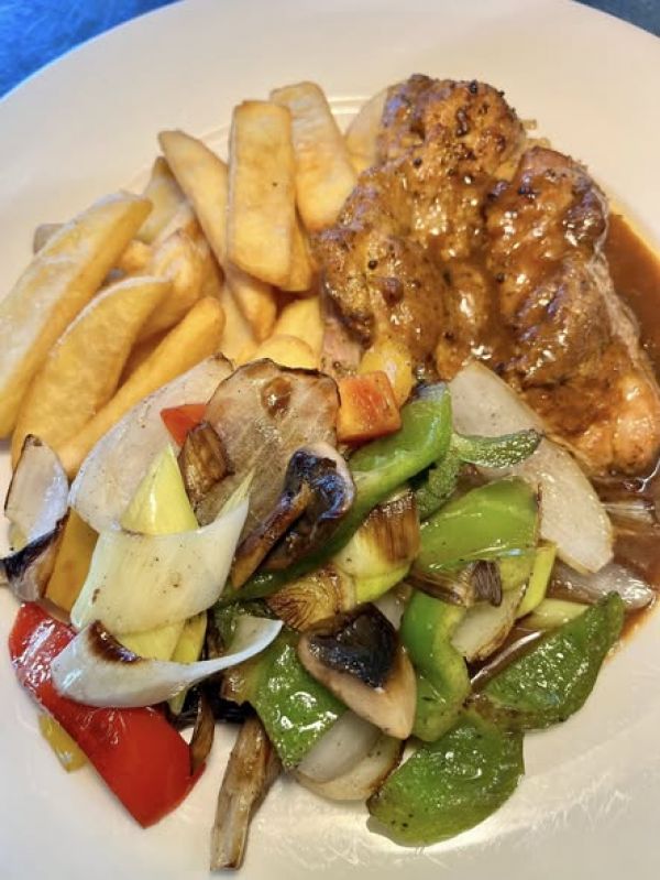 150g Steak z vepřové krkovičky na grilu, pepřová omáčka, americký brambor s česnekem, ďábelská omáčka, obloha 137