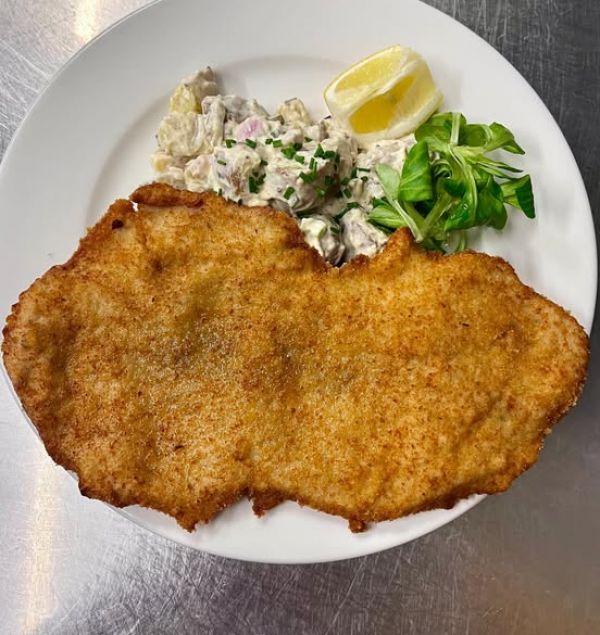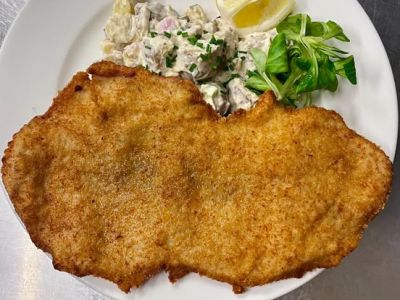 150g Smažený vepřový řízek s česnekem, vídeňský bramborový salát, obloha 1371012