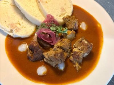 Hovězí guláš s karlovarským knedlíkem, červená cibule