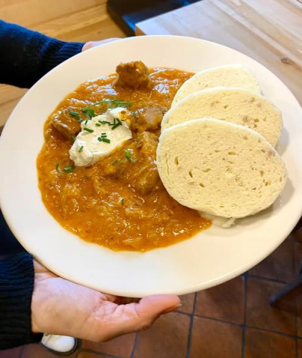 Bramborové knedlíky plněné uzeným masem, bílé zelí a cibulka