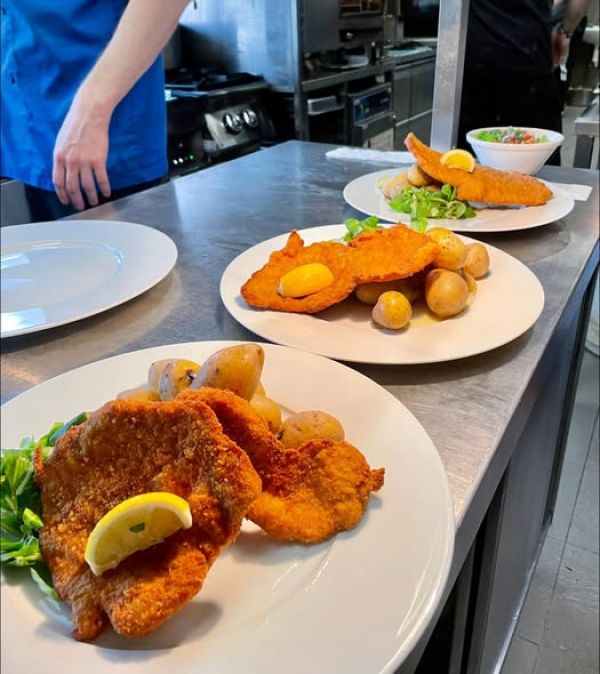 Vídeňská hovězí roštěná, sázené vejce, hranolky, tatarská omáčka 1 3 7 9