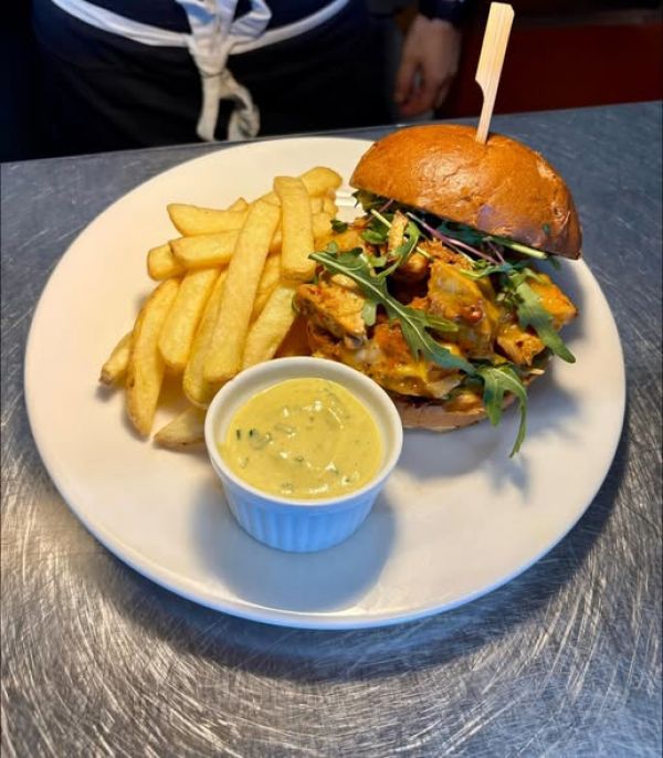 200g Burger s trhaným kachním masem, cibulovým chutney, rajčetem, rukolou a slaninovou mayo, steakové hranolky 137