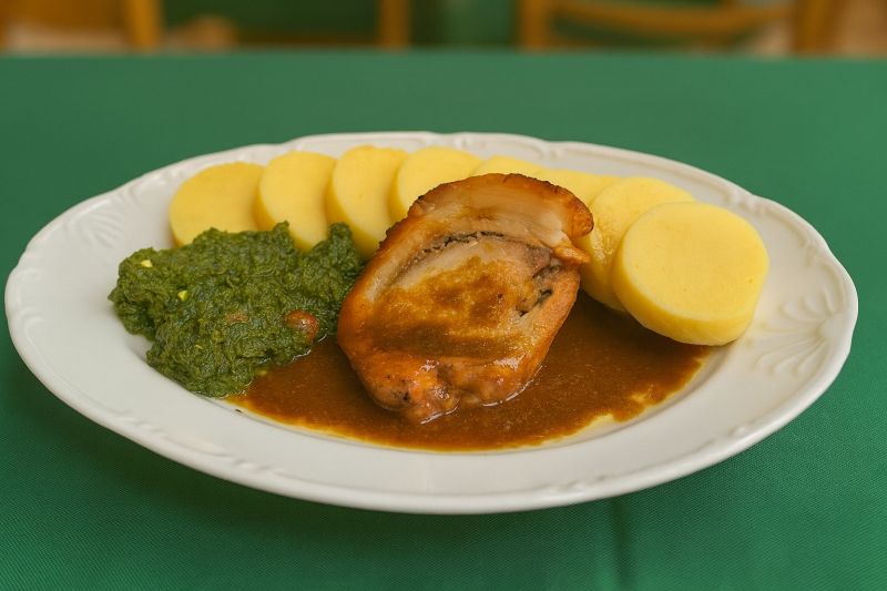 250g Pečené králičí stehno na česneku, špenát, bramborový knedlík A: 1, 3, 7