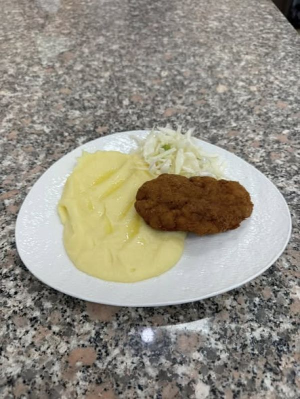 150g Smažený kuřecí řízek, bramborová kaše, zelný salát A: 1, 3, 7, 10, 12