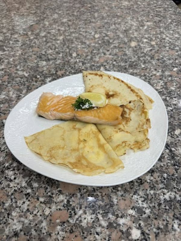 Smažený sýr v briošce (Eidam 45% nebo hermelín s pikantní majonézou, s plátky rajčat, červené cibule a kyselé okurky, smažený ve strouhance, podávaný se salátem Coleslaw a smaženými hranolkami