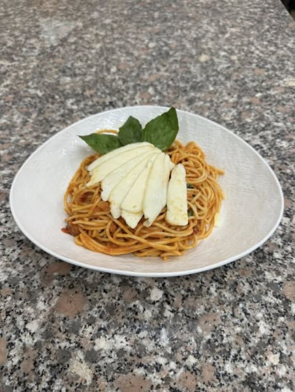Špagety s boloňskou masovou směsí sypané sýrem