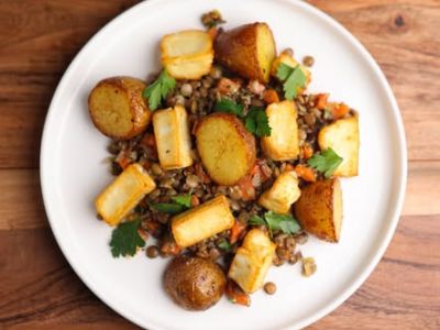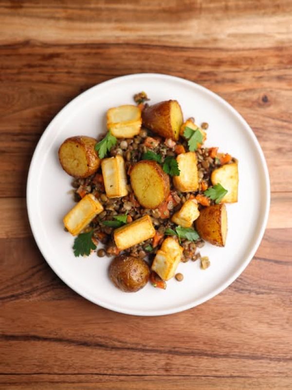 Červená čočka, grilovaná klobáska, čerstvý chléb