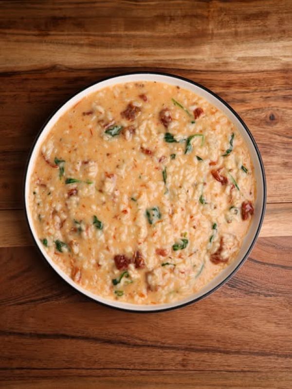 Těstoviny s uzeným lososem, česnekem, sušenými rajčaty, smetanou, italským sýrem a čerstvou rukolou