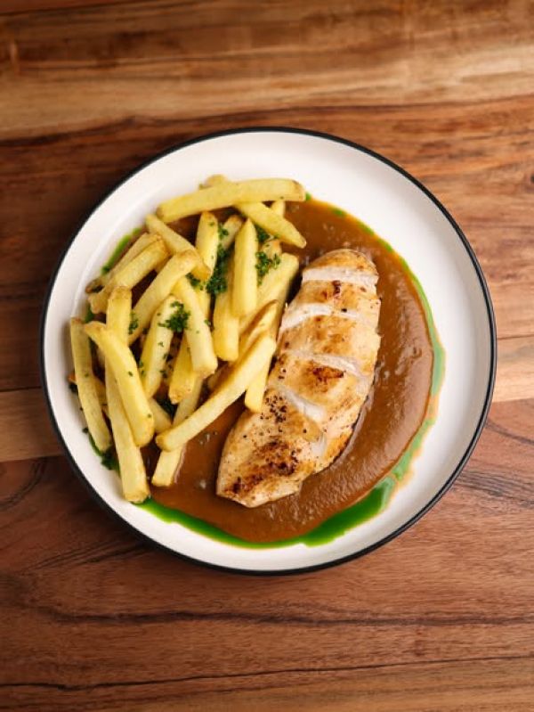 100g Kuřecí prsa se šunkou a rozpečenou goudou, 100g Hranolky