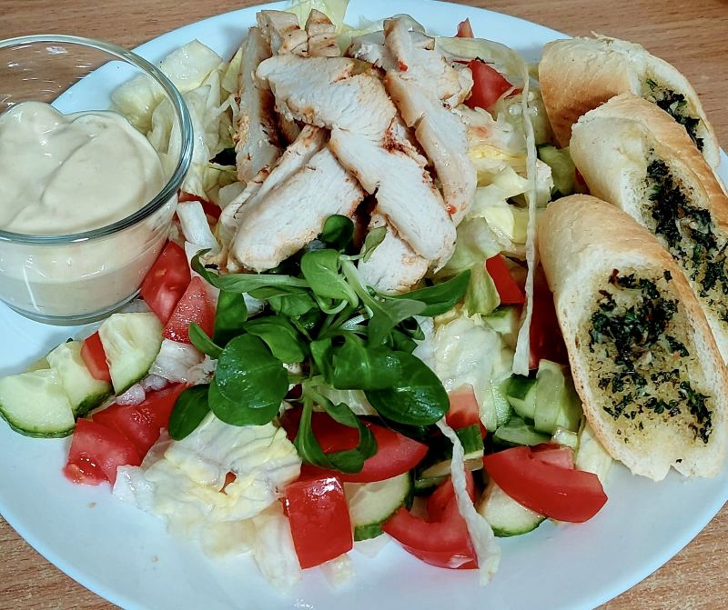 3. Zeleninový salát s francouzským dresinkem a kuřecími stripsy, bagetka A1a, A3, A7