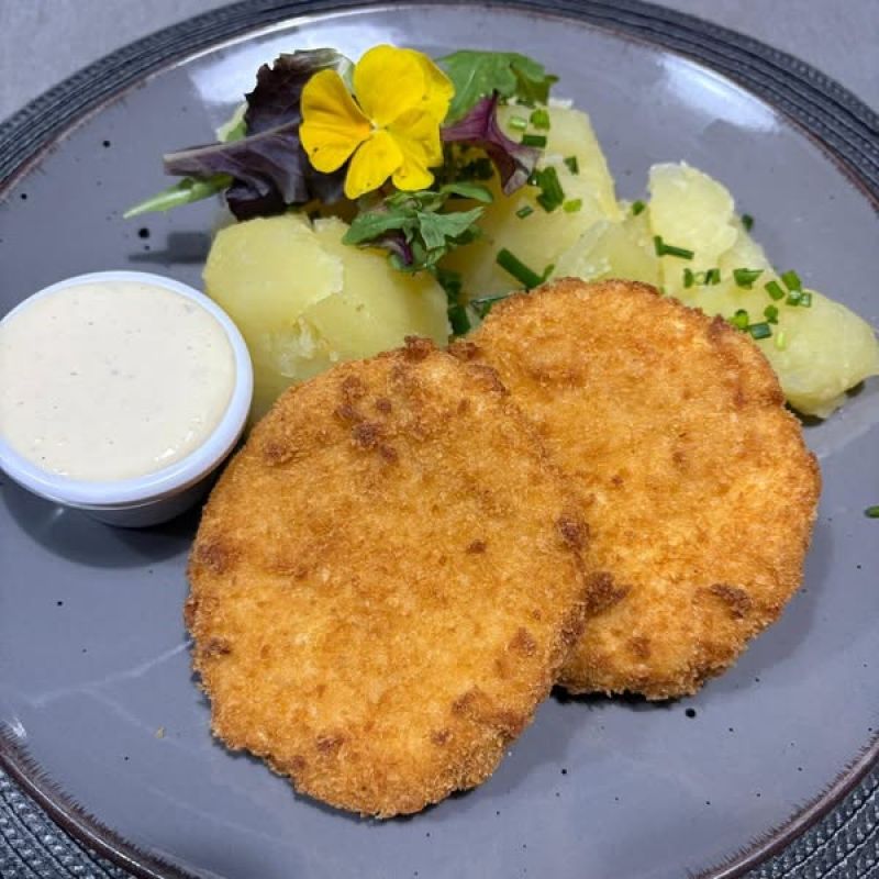 Kuřecí řízek XXL, bramborová kaše, rajčatový salátek