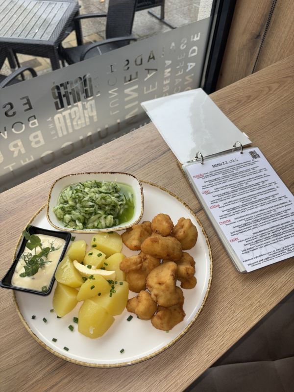 Smažené sýrové trio (gouda, niva, korbačík), máslové brambory sypané pažitkou, naše tatarka