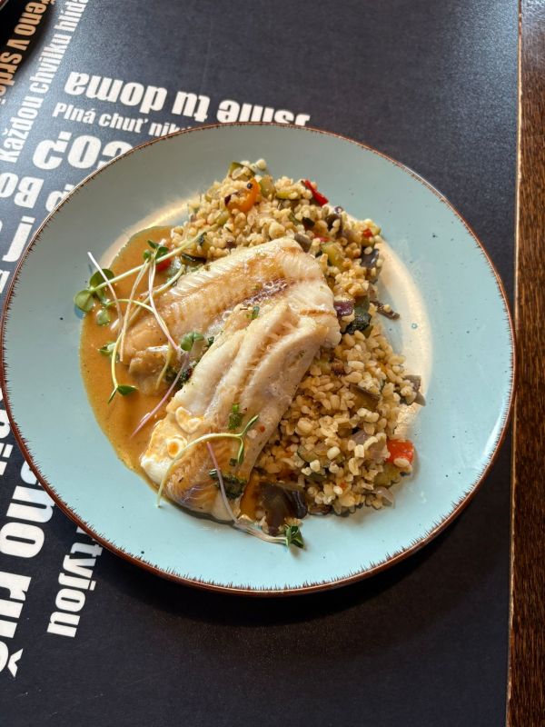 Rybí filé v bylinkovo-sýrové krustě, bramborová kaše, ovocný kompot