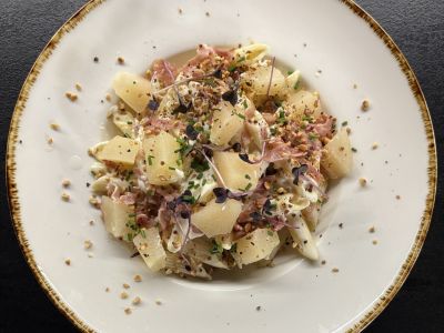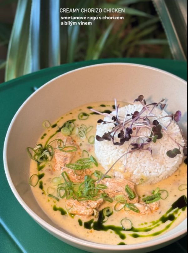 Duroc krkovice (Smetanové brambory s chorizem, pórkem a parmazánem)