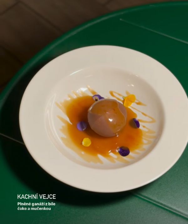 200g Kuřecí prso na zelených fazolkách se slaninou, sázené vejce, hranolky 13