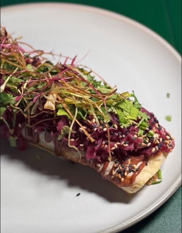 LOKŠ MÌ plněné lokše trhanou vepřovou plecí, citrónová tráva, marinovaný salátek z mrkve, okurky a bílé ředkve v zálivce Nước chấm, koriandr, jarní cibulka, smažená cibulka (1, 4, 11) 1411