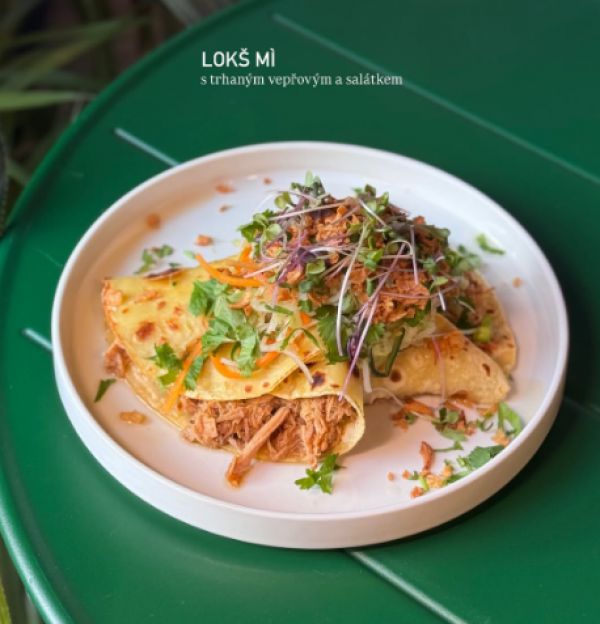 Burrito, bramborové lupínky, koriandrová smetana (tortilla plněná trhaným hovězím masem s rajčaty, kukuřicí, fazolemi a salátkem)
