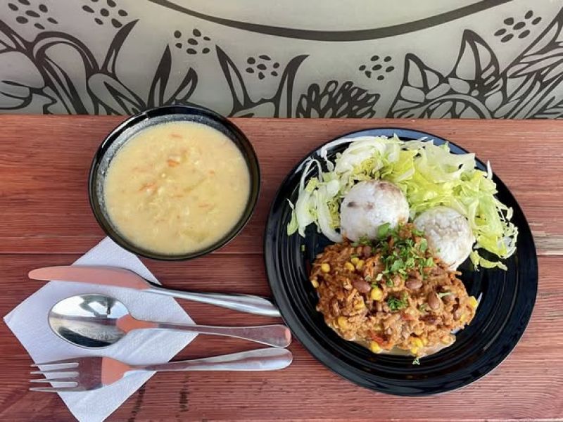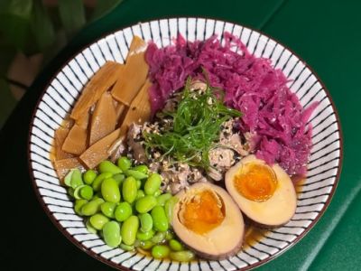 Poke bowl s krevetovými špízky- sushi rýže, červené zelí, mrkev, cukrový hrášek, mango, jarní cibulka, chilli paprička, kešu oříšky, limetková mayo