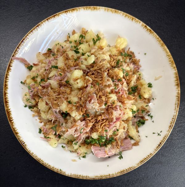 Germknödel (červené karamelizované zelí, trhané husí maso, vídeňská cibulka)