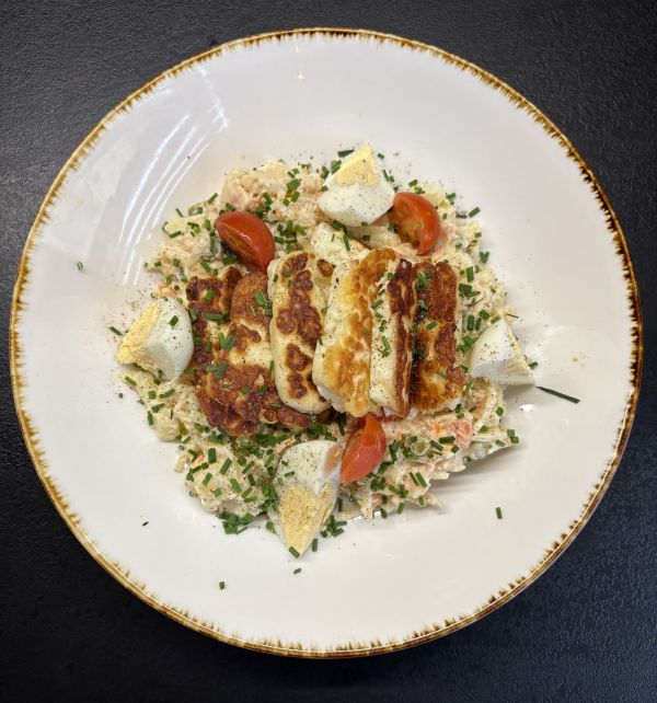 Zeleninový salát s vepřovou panenkou a mozzarellou, rozpékaný toust