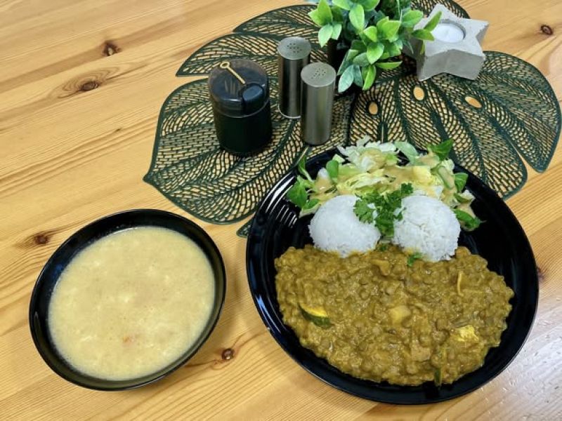 Čočka na kyselo s uzeným masem, chléb, smažená cibulka, kyselý okurek