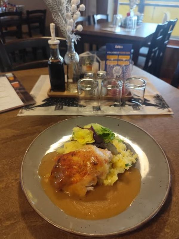 350g pečené kuřecí stehno s bramborovou kaší a kys. okurkem 7, 1