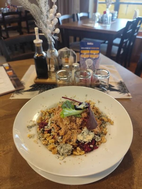 Husí burger (Trhané husí maso, perníková omáčka, restované červené zelí s divokými brusinkami a rozinkami s portským vínem, salát, bunska batátová)