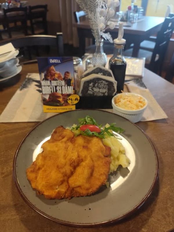 Smažený kuřecí řízek, bramborový salát s majonézou