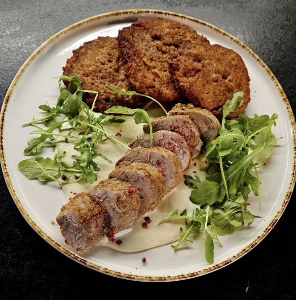 Krůtí játra na roštu, myslivecké brambory, zeleninová přízdoba