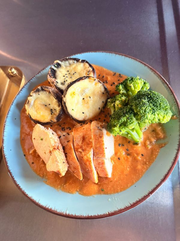 Kuřecí steak na roštu s houbovým přelivem, opečené brambory s tymiánem