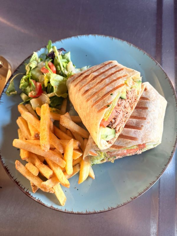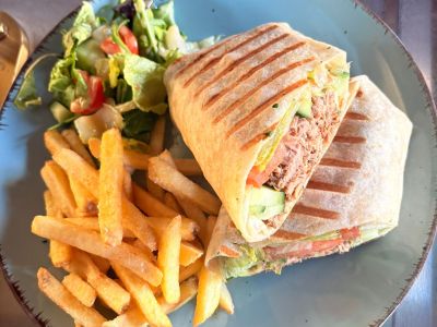 Tortilla s kuřecím masem a zeleninou, hranolky. tatarka