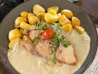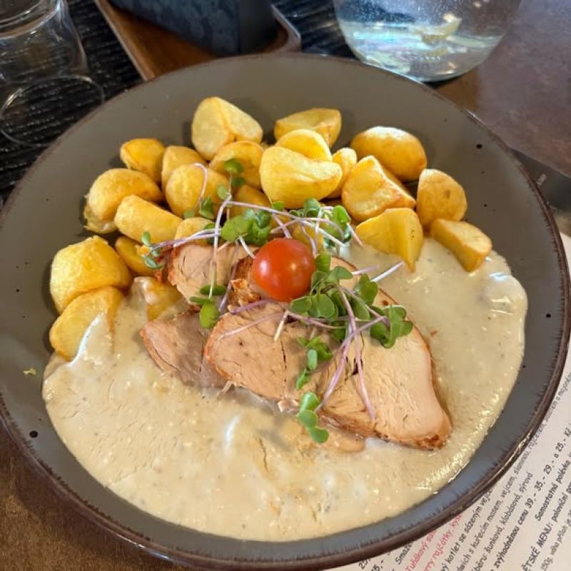 200 g Pečená krůtí prsa ve slanině, omáčka smetanový demi glace, hranolky