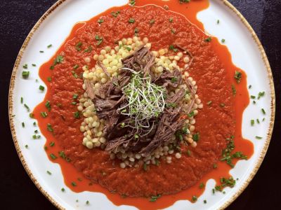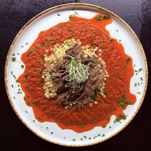 Filírovaná vepřová panenka, masová omáčka, rýžové rancini, glazované kapsičky, granátové jablíčko, microgreens