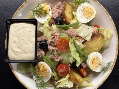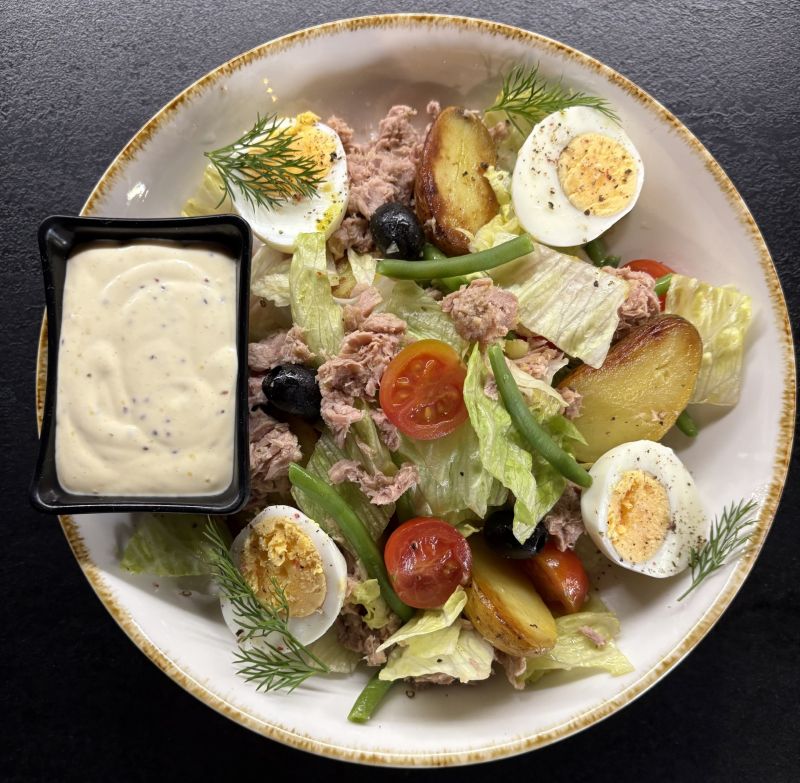 Salát s vepřovou panenkou a mozzarellou, sázené vejce, toust