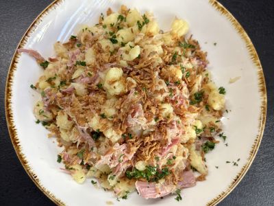 Francouzské brambory (Zapečené brambory, hrášek, vejce, uzené maso, okurkový salát)