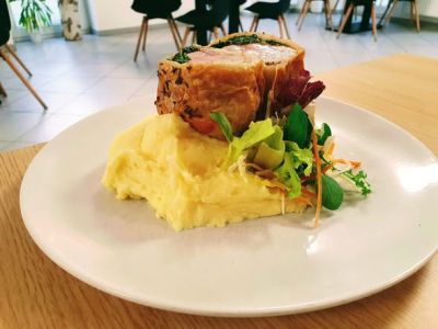 Kuřecí plněné tyrolským sýrem, šalvějí a lonzou amatriciana, medovo-horčičná omáčka, salátek, domácí pečivo 219 - do vyprodání