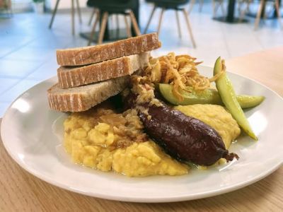 Hrachová kaše, uzené maso, kyselý okurek, chléb 179