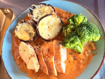 Pečená Tilapie s bylinkami na bulguru s grilovanou cuketou a lilkem, olivami a feta sýrem