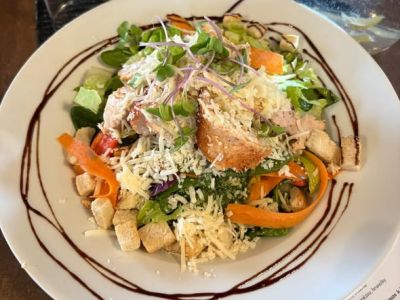 150g Steak z lososa na míchaném zeleninovém salátku, opékané toast
