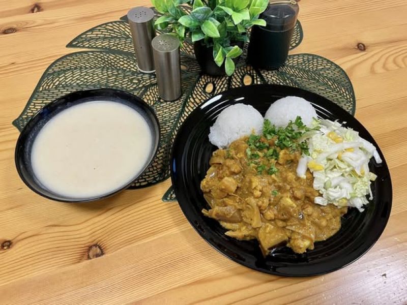 Chicken Korma sypaná plátky mandlí a čerstvým koriandrem, basmati rýže