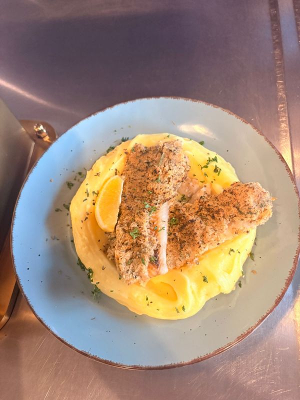 Smažené stripsy z aljašské tresky, bramborová kaše, ovocný kompot