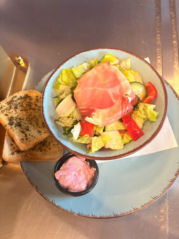 150g Steak z lososa na míchaném zeleninovém salátku, opékané toast